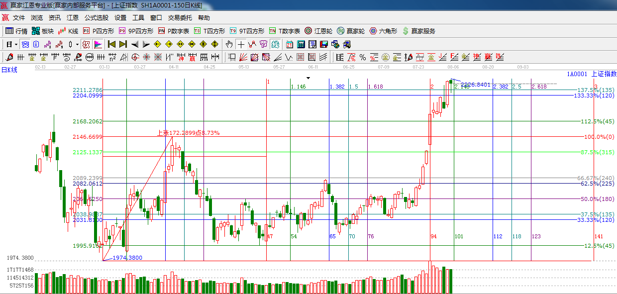 ★依據(jù)贏家江恩系統(tǒng)波段百分比提示:指數(shù)在權(quán)重的全面推動下,再創(chuàng)新高,突破了120度,135度位置,2204,2211點(diǎn)轉(zhuǎn)換為支撐,上方阻力是180度 2232點(diǎn),225度2254點(diǎn)。