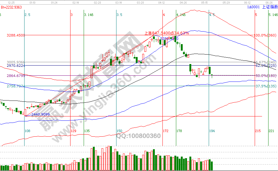 5月除9號(hào)至17號(hào)時(shí)間窗口有一次操作機(jī)會(huì)外,判斷的本月還會(huì)有一次布局機(jī)會(huì),從空間波段百分比1倍循環(huán)二分位2834點(diǎn)與極反通道藍(lán)色下軌線(詳見工具)是參考區(qū)間,贏家江恩系統(tǒng)時(shí)間周期方面,本周短周期重要時(shí)間窗口是23號(hào),日線時(shí)間窗口是28(29)號(hào)。通過(guò)系統(tǒng)工具預(yù)判方法得出參考空間與時(shí)間后,投資者要做的就是跟隨市場(chǎng)并做出應(yīng)對(duì)策略,并且預(yù)判此區(qū)間展開的反彈要強(qiáng)于第一波,具體空間與時(shí)間會(huì)在系統(tǒng)VIP學(xué)員公布。21號(hào)盤中壓力是90度2894點(diǎn)、135度2870點(diǎn),盤中支撐是315度2844點(diǎn)、270度2829點(diǎn)。操作策略,指數(shù)擊破黑色生命線進(jìn)入弱勢(shì)區(qū)域,高風(fēng)險(xiǎn)者倉(cāng)3成,低風(fēng)險(xiǎn)者本周進(jìn)入備戰(zhàn)等待信號(hào)。