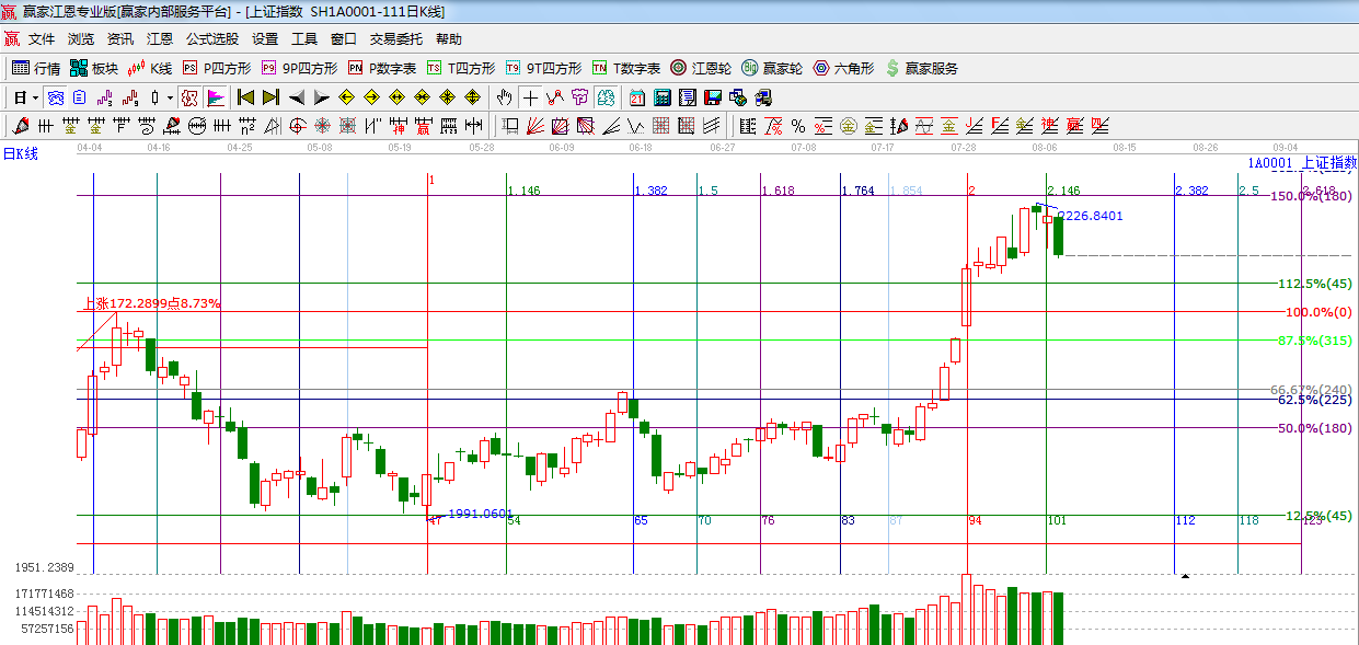 ☆依據(jù)贏家江恩系統(tǒng)黃金時(shí)間周期線提示:昨天寫到8月06日窗口,指數(shù)有誘多嫌疑,如期中陰下跌,