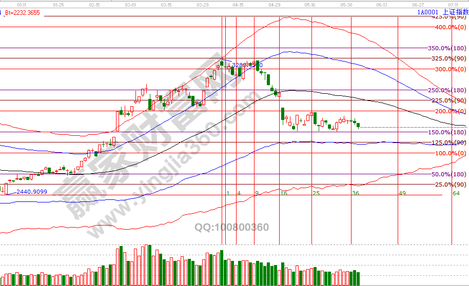 6月第一個時間窗口4、5號,日K線再探江恩輪中輪(2847點)、江恩箱2*1線(2850點)位置,今天最低點(2851點)同江恩箱所提示的支撐位僅1點之差,同時波段百分比延伸線1倍循環(huán)180度2834點,多個價格工具共振區(qū),綜合結(jié)論是2840附近為強支撐,5月份三次下探后均展開不同程度的反彈。目前時間窗口繼續(xù)關注2840附近支撐,此線如失守則調(diào)整短線應對策略,下方為極反通道藍色下軌線。贏家江恩交易體系中強調(diào),只在關鍵位進行交易,如4月22號失守極反通道上軌線減倉,4月25號再度減倉或空倉,5月9號參與反彈等等。明天將揭曉拐點是否形成,6月第一個時間窗口如產(chǎn)生不了轉(zhuǎn)折,則下個時間窗口13號是日、周線共振,級別要大于近期時間窗口。5號盤中壓力是45度2877點、90度2894點,盤中支撐是315度2844、270度2829點。操作策略,指數(shù)擊破黑色生命線進入弱勢區(qū)域,整體持倉保持在3-4成,做到進可攻退可守。