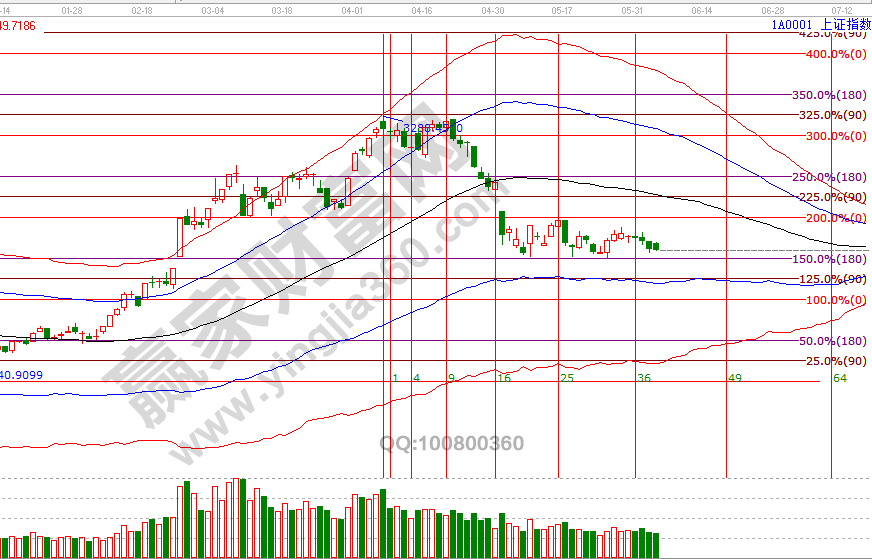 大盤時間窗口未給出明確的方向選擇,延續(xù)空間分析波段百分比延伸線1倍循環(huán)180度2834點(diǎn)與2倍零度位2966點(diǎn)區(qū)間震蕩,因端午假期,本周僅剩一個交易日,如明天市場延續(xù)震蕩格局,則下周將是周線、日線時間窗口期,維持1個月的橫盤后無論是上下市場都會給一個方向。隨著時間的推移,市場人氣情緒必會有一次爆發(fā),從技術(shù)角度研究,百分比2834-2780(極反通道藍(lán)色下軌線)這里出現(xiàn)轉(zhuǎn)強(qiáng)信號則能帶動場外資金入場。當(dāng)前贏家江恩給出的策略為,高風(fēng)險者在2840附近可以參與,運(yùn)用區(qū)間交易法;低風(fēng)險者可以等出現(xiàn)中陽或指數(shù)靠近藍(lán)色下軌線附近開倉。6號盤中壓力是45度2877點(diǎn)、90度2894點(diǎn),盤中支撐是315度2844、270度2829點(diǎn)。操作策略,指數(shù)擊破黑色生命線進(jìn)入弱勢區(qū)域,整體持倉保持在3-4成,做到進(jìn)可攻退可守。