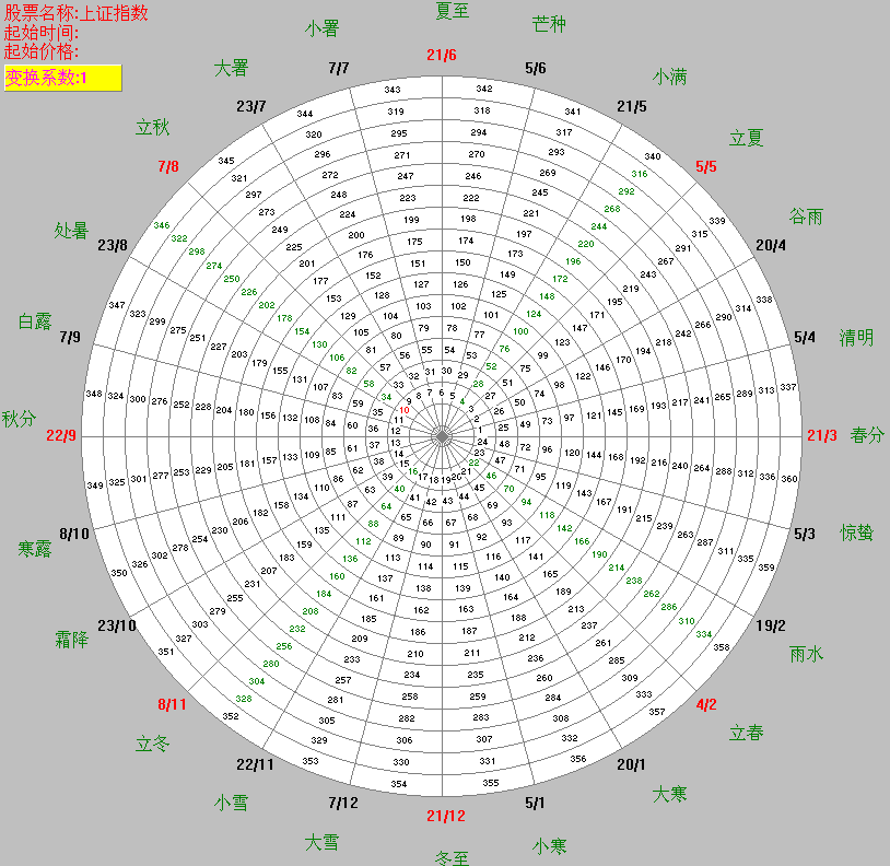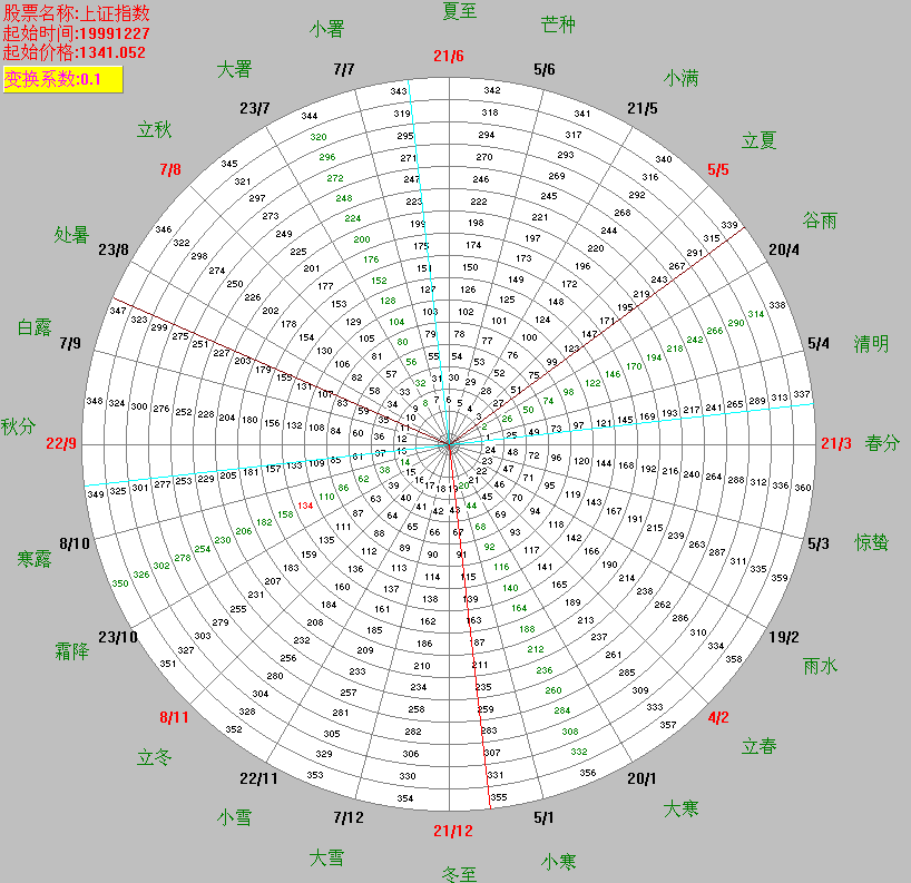 如果股價(jià)或指數(shù)較大或較小不能在360數(shù)的輪中輪顯示,則可以選擇適當(dāng)?shù)淖儞Q系數(shù),將股價(jià)或指數(shù)進(jìn)行變換使其對(duì)應(yīng)輪上的一個(gè)數(shù)字,這個(gè)數(shù)字是用紅色表示的。
