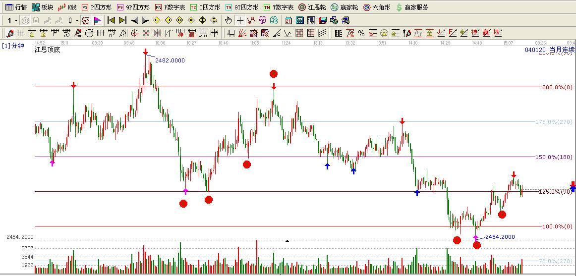 股指期貨在其高點2482.00跌至當(dāng)天低點【圖中1所示】這里是其江恩波段百分比延伸線90度位置2461、這里也是贏家系統(tǒng)工具江恩頂?shù)装l(fā)出粉紅色買入的信號,共振買點附近出現(xiàn)了快速反彈,這一波上行遇到180度位置遇阻在一次下跌,再次考驗江恩波段百分比延伸線90度位置支撐。這里是江恩規(guī)則2在單底、雙底和三重底買入應(yīng)用買點也是其規(guī)則3按百分比買賣規(guī)則 共振買點。構(gòu)成了一個絕佳的買點。這個小雙底直接突破江恩波段百分比延伸線180度位置,這里也是頸線位置,突破后看高一線至270度位置,回踩180度位置形成了3安全買點,這一波上行依然運(yùn)行在其江恩波段百分比延伸線位置在其0度位置后再一次下行,這里也是其贏家系統(tǒng)江恩頂?shù)滓婍敯l(fā)出賣的信號