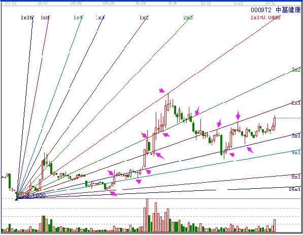 甘氏線雖然常見,但是不是所有人都可以用好,這是因為這僅僅是江恩的比較獨特的工具之一,使用甘氏線還是要完全理解江恩理論的思想,在實戰(zhàn)中才能發(fā)揮出來他應(yīng)用的作用,不然就是套工具罷了。贏家江恩軟件中甘氏線的有兩組,對于甘氏線的研究更是貼近江恩當年的使用,有興趣大家可以多多學習一下江恩角度線欄目的文章或者學習關(guān)于江恩角度線的視頻講解。分享一張關(guān)于中基健康的贏家江恩軟件甘氏線分析圖形,供大家學習。