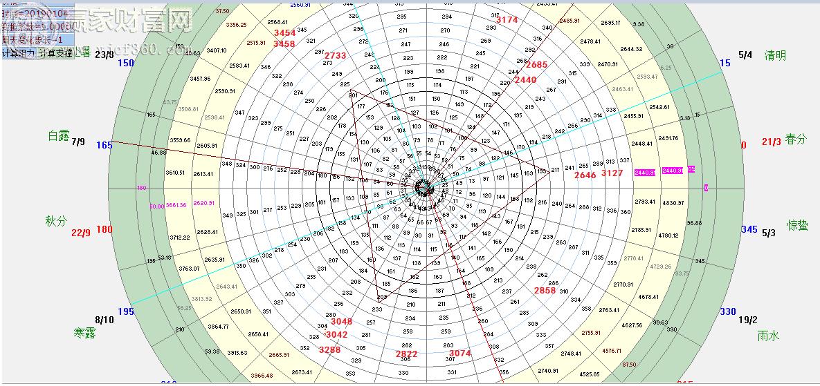 贏家江恩在其中更是融合了中國二十四節(jié)氣及天干地支思想。其結構從外圈到內圈,依次是24節(jié)氣——自然日時間——度數(shù)(春分對應0度)——價格度數(shù)(起點價格是0度)——比例(起點價格的重要比例)——支撐或阻力(黃色的兩圈,一圈為百分比,一圈為輪子循環(huán)結構值。)——輪子內部數(shù)字排列(即1-360)。