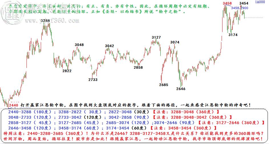 圖形解析:打開贏家江恩輪中輪,在圖中找到大盤頂?shù)讓臄?shù)字,跟著下面的路徑,一起來感受江恩輪中輪的神奇吧!