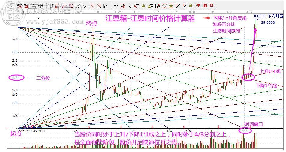 圖形解析:東方財(cái)富,以2012年12月7日低點(diǎn)和2015年6月5日高點(diǎn)為起始波段,時(shí)間周期為121周,根據(jù)市場(chǎng)具體的走勢(shì),步長(zhǎng)設(shè)定為121*6=726周,得出如上的分析圖??梢钥吹绞袌?chǎng)價(jià)格在周期內(nèi)的波動(dòng)情況,其中最關(guān)鍵的角度線的1*1線都是重要的阻力和支撐點(diǎn),以及價(jià)格的4/8分割位,而當(dāng)股價(jià)同時(shí)站上了兩條角度線的1*1線和價(jià)格的4/8分割位,就意味著市場(chǎng)趨勢(shì)非常強(qiáng)勢(shì)。因而,當(dāng)股價(jià)突破了這幾個(gè)關(guān)鍵的位置后,4/8分割時(shí)間序列窗口開啟主升。