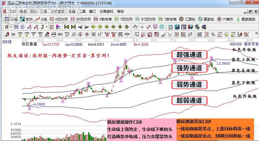 1.判斷趨勢:極反通道中間的黑色線,稱為生命線。依據(jù)股價(jià)與生命線的關(guān)系:股價(jià)在生命線以上,則股票強(qiáng)勢可以操作;股價(jià)在生命線以下,則股票弱勢暫不考慮。生命線是一個(gè)強(qiáng)勢股票的啟動(dòng)點(diǎn),所以贏家建議優(yōu)先考慮生命線附近的股票,有強(qiáng)勢股不做弱勢股。