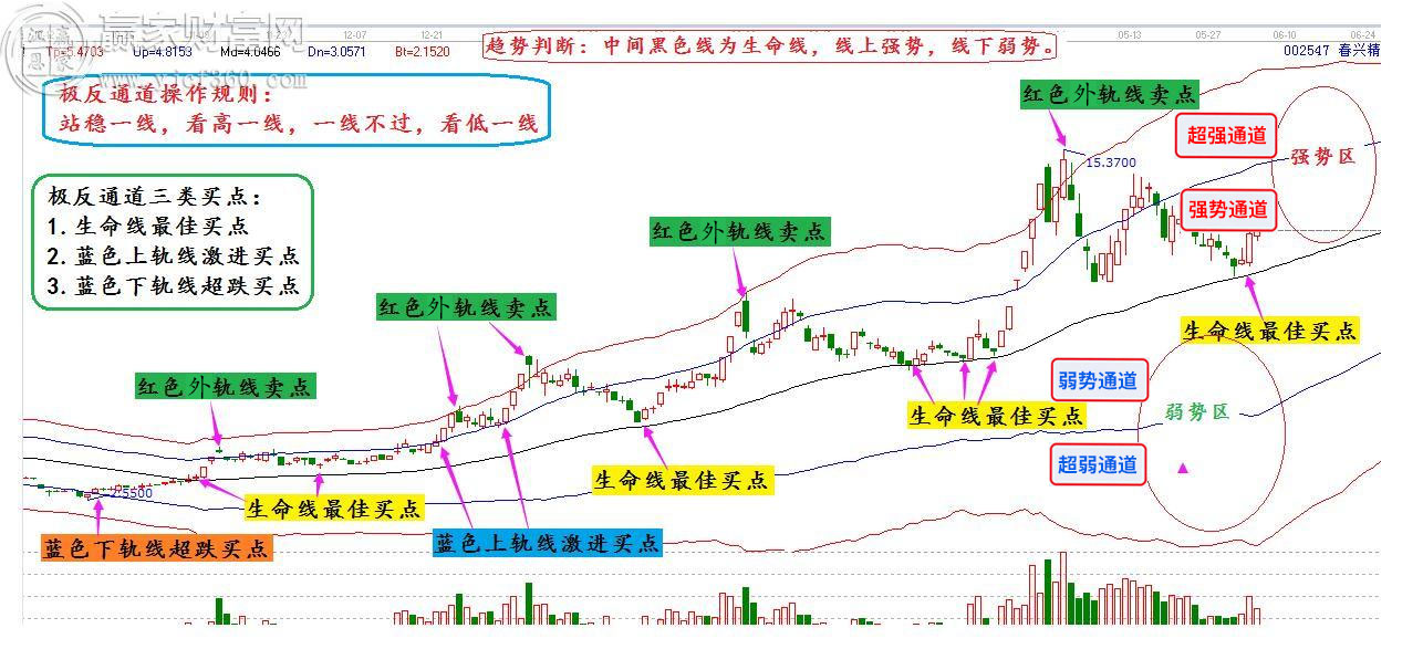 圖形解析: 春興精工,點(diǎn)擊鼠標(biāo)右鍵,可直接調(diào)出極反通道工具??梢钥吹剑蓛r(jià)在2018年11月8日倍量突破了生命線,隨后震蕩未跌破,股價(jià)進(jìn)入強(qiáng)勢可操作階段。市場在2019年1月30日,3月底,股價(jià)連續(xù)回踩生命線構(gòu)成最佳買點(diǎn),都是階段低點(diǎn)。在2018年12月26日,2019年1月10日,2月26日,4月23日,紅色線附近見階段高點(diǎn)。1月4日紅色線縮量回踩至藍(lán)色線構(gòu)成買點(diǎn)。按照生命線附近支撐買入,紅色線賣出的規(guī)則,強(qiáng)勢階段的關(guān)鍵買賣點(diǎn)都是可以準(zhǔn)確把握。