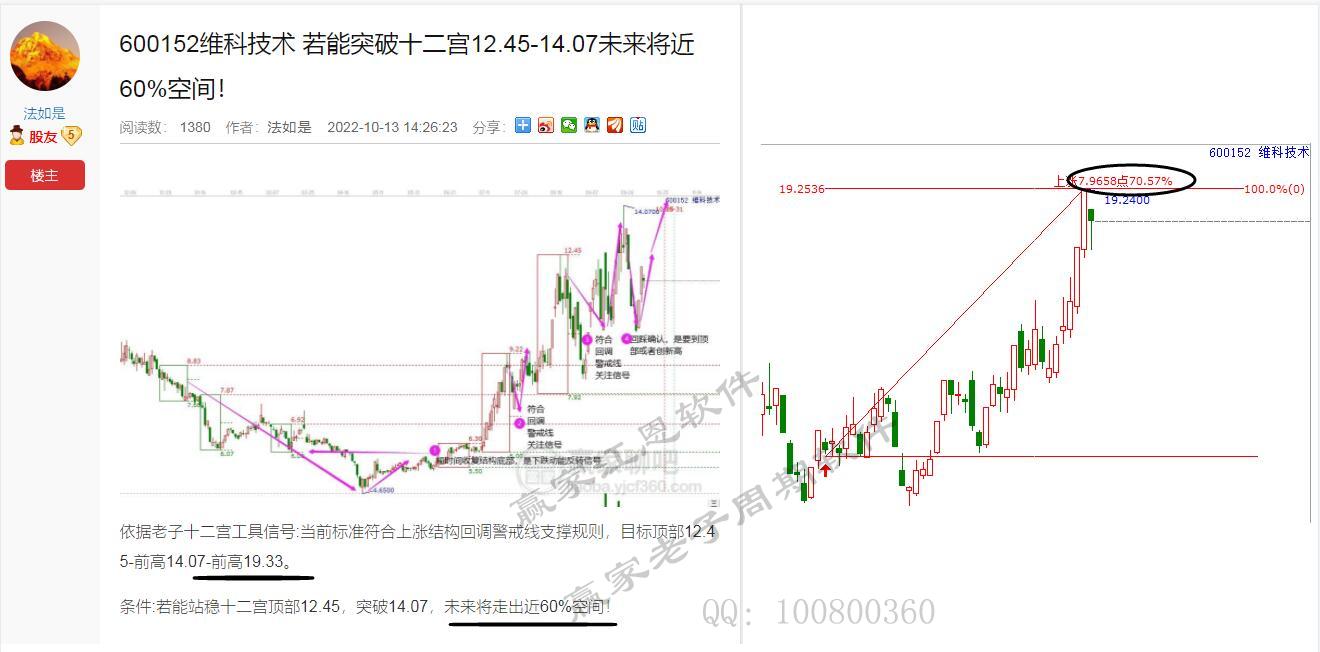 回顧驗(yàn)證:10月13號(hào)運(yùn)用江恩工具信號(hào)選出后,波段持續(xù)上攻!當(dāng)突破預(yù)測的14.07元開始給板加速抵達(dá)目的地19.33元。空間到達(dá)后,就是止盈位。走出70%上行利潤兌現(xiàn)!