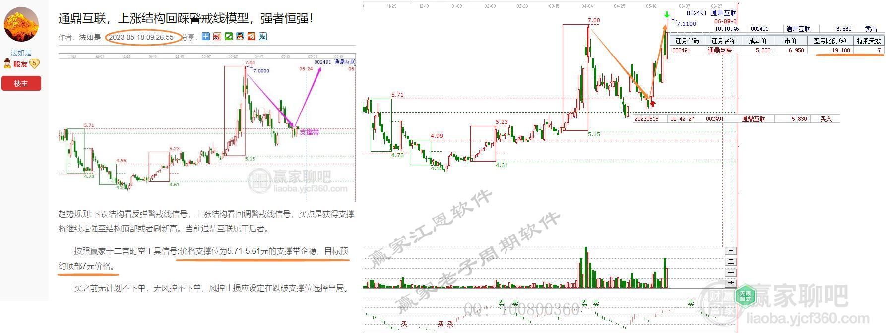 案例通鼎互聯(lián)為例,自5月18日早盤前運(yùn)用贏家十二宮解析并持有,預(yù)期當(dāng)前支撐位5.71-5.61元,目標(biāo)位至7元。最終走出,歷時(shí)7天,抵達(dá)江恩分析法預(yù)測(cè)的特定波動(dòng)空間價(jià)格7元。盈虧比例快速達(dá)到19.18%。那么如何站在實(shí)戰(zhàn)角度預(yù)測(cè)如何歸于實(shí)盤交易呢?