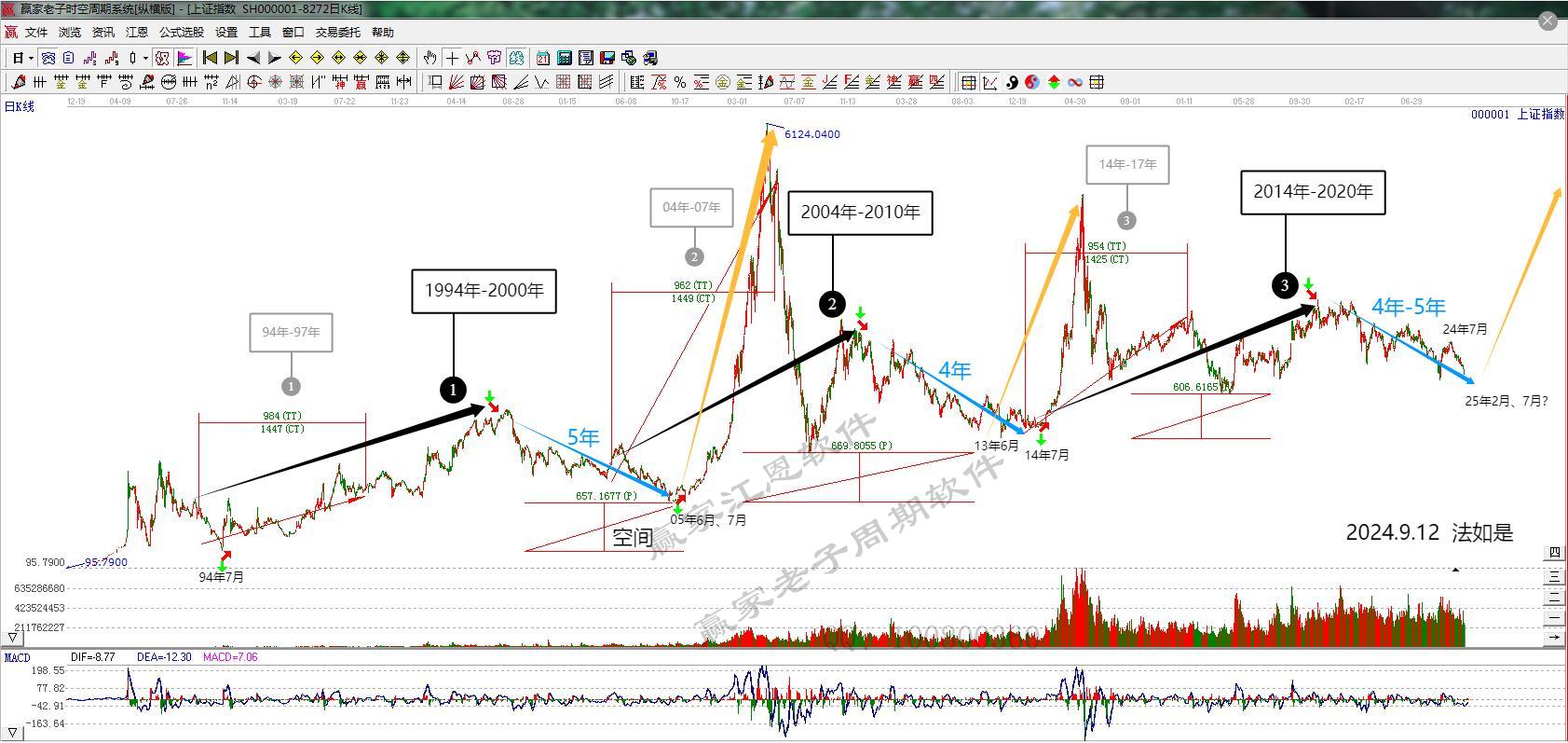 再看時間,縱觀歷史以94年為時間起點,每輪大的上漲周期均為6年,下跌周期為4年,共計10年。說明:贏家的時空周期誤差單位為1(年/月/周/日),若以年為單位,上下空間幅度在100點之內(nèi)(即是圖中669點-606點),左右時間的誤差同樣在1年(即是圖中回調(diào)4年-5年)。以月為單位,每次大牛的時間啟動點均在7月(即是圖中的6月7月),研究歷史預(yù)判未來,以史為鏡知興替。本次時空圖表顯示,上證指數(shù)即將醞釀形成第四輪大牛市,相似相當(dāng)即為重復(fù),預(yù)計本輪時間啟動點大概率還會在2025年7月左右?;仡櫄v史,下跌5年周期后,空間拉升歷史最高點6000點,那么本輪若同樣以回調(diào)5年的重復(fù),空間6000點-10000點都是大有可能的。同理再往后大膽預(yù)測小心求證,2030年是否同樣要規(guī)避4-5年的風(fēng)險周期?直至2034年左右重新開啟新一輪的牛市行情?老祖宗說過,歷史在重復(fù)發(fā)生...太陽底下沒有新鮮事...所以時勢造英雄,一定是順勢而為!