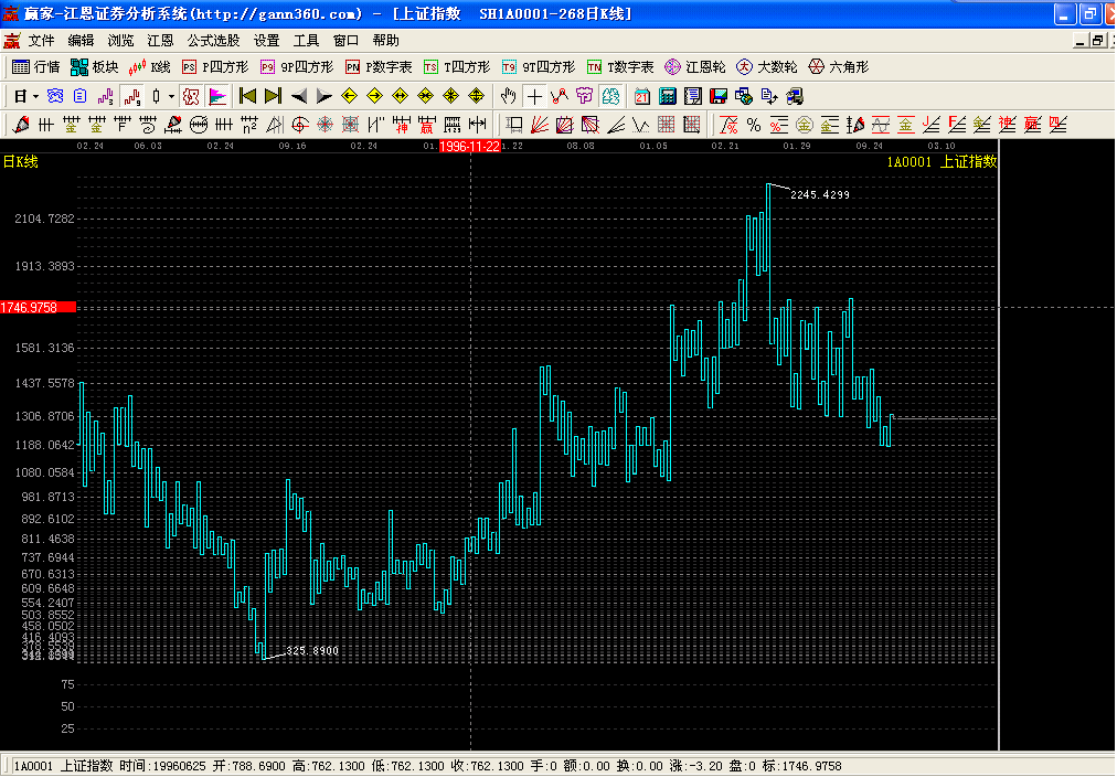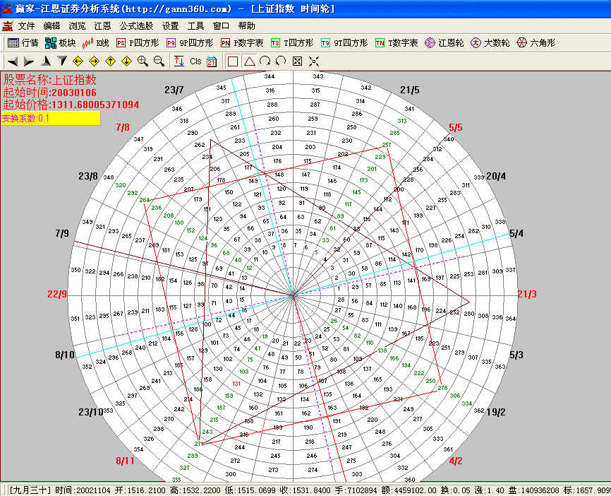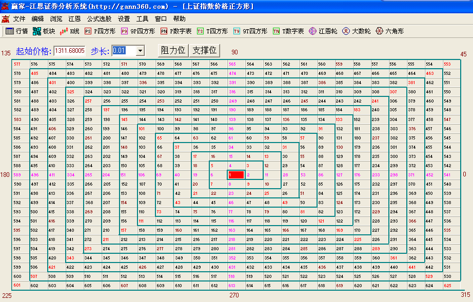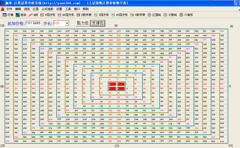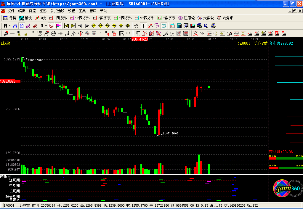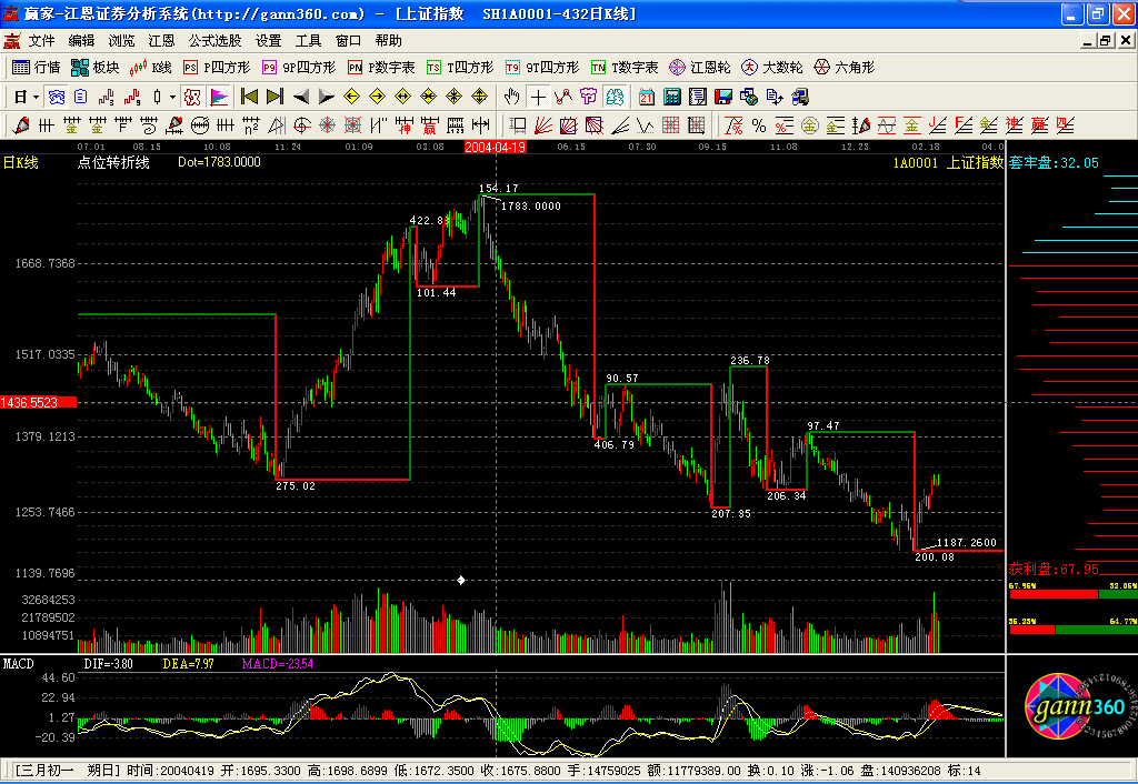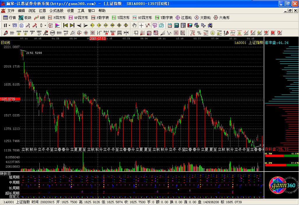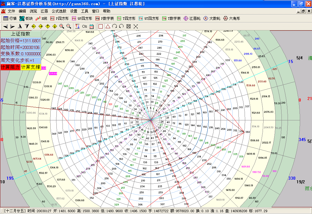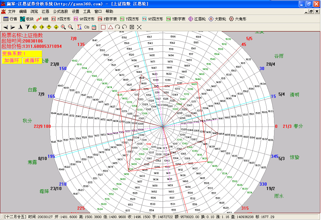 本軟件除實現了江恩的經典判市工具:包括江恩輪、價格正方形、九格價格正方形、時間正方形、九格時間正方形、六角形、角度線、江恩計算器、時間及價格循環(huán)線、時間周期線、江恩價格回調帶外,增加了百分比線、百分比延伸線、黃金延伸線、黃金回調帶、黃金分割阻力支撐線、k線價格四方形、自定義時間價格計算器、黃金時間周期線、螺旋時間周期線、自定義周天江恩時間循環(huán)線、平方時間循環(huán)線、三點周期線、螺旋歷法時間循環(huán)線、k線時間論中論(變盤點)、k線時間四方形(變盤點)、時間轉折日提示、24節(jié)氣轉折日提示、神奇周期線、神奇價格線、贏家周期線、自定義時間周期線、趨勢轉折線、點位跟蹤轉折線。