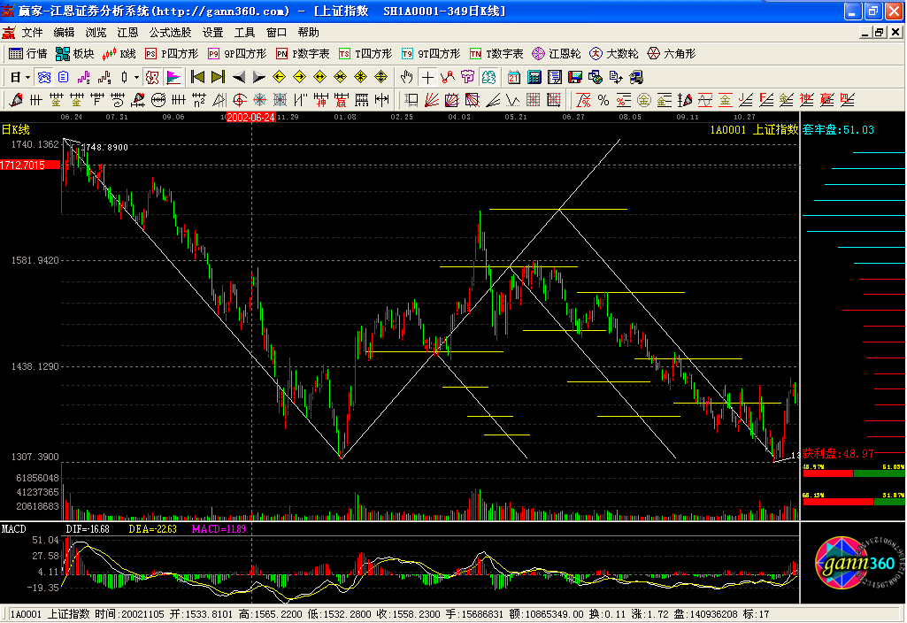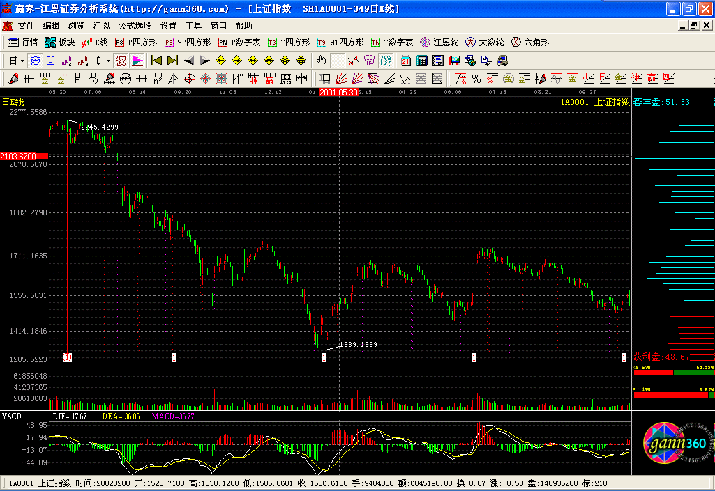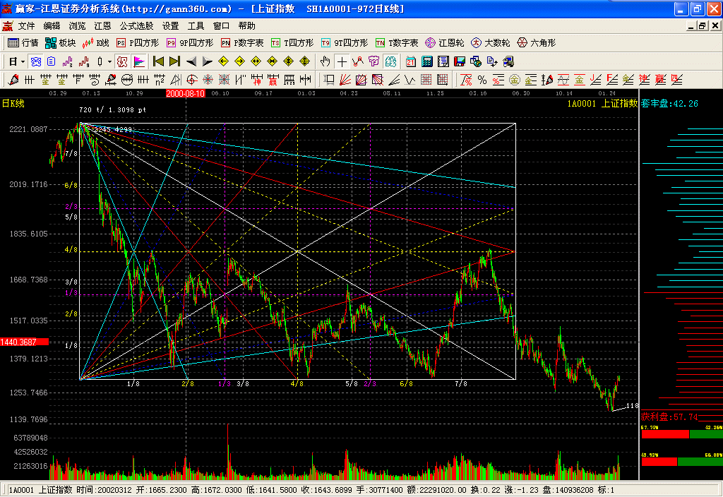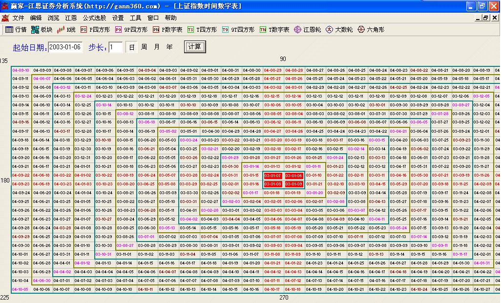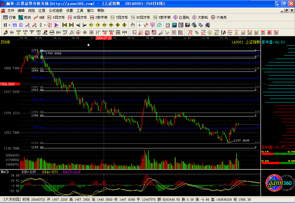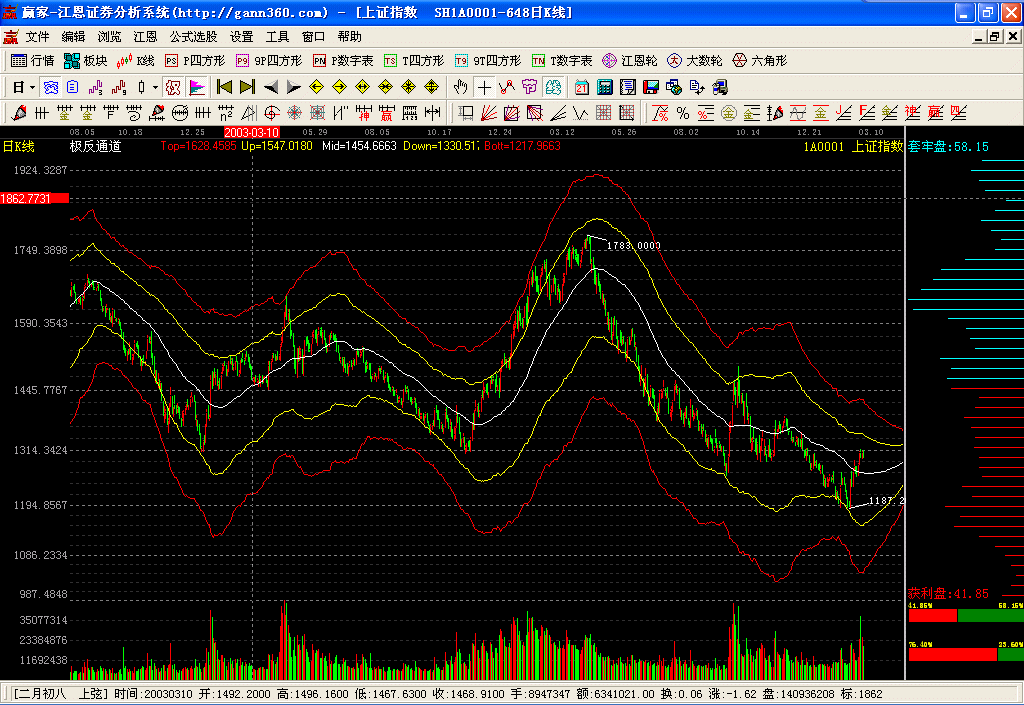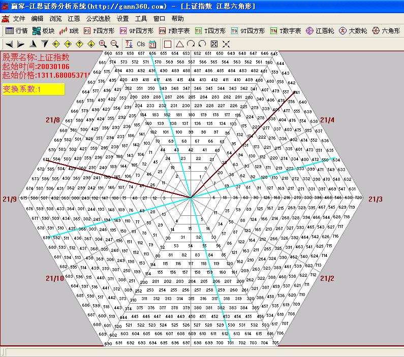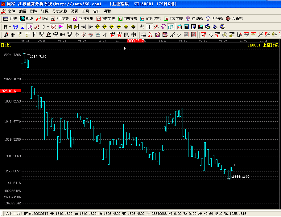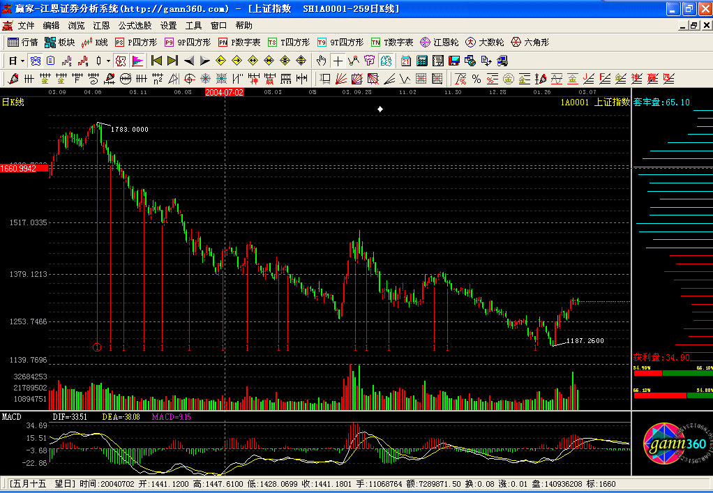 本軟件除實現了江恩的經典判市工具:包括江恩輪、價格正方形、九格價格正方形、時間正方形、九格時間正方形、六角形、角度線、江恩計算器、時間及價格循環(huán)線、時間周期線、江恩價格回調帶外,增加了百分比線、百分比延伸線、黃金延伸線、黃金回調帶、黃金分割阻力支撐線、k線價格四方形、自定義時間價格計算器、黃金時間周期線、螺旋時間周期線、自定義周天江恩時間循環(huán)線、平方時間循環(huán)線、三點周期線、螺旋歷法時間循環(huán)線、k線時間論中論(變盤點)、k線時間四方形(變盤點)、時間轉折日提示、24節(jié)氣轉折日提示、神奇周期線、神奇價格線、贏家周期線、自定義時間周期線、趨勢轉折線、點位跟蹤轉折線。