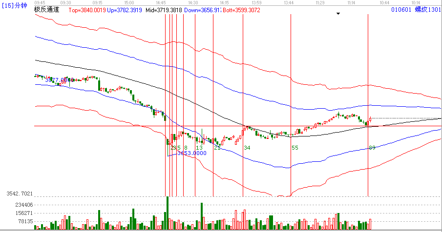 螺紋跌至新低,極反通道弱勢(shì)紅色外軌,然后震蕩周強(qiáng),在15分周期的55根k線回踩極反通道生命線,按照極反通道買賣法則,突破極反通道生命線然后回踩生命線的位置為最佳買點(diǎn),第一目標(biāo)極反通道上軌今日開盤最高點(diǎn)位跟5分鐘的極反通道上軌位置共振賣點(diǎn),然后回落,跌至15分極反通道生命線的位置【這個(gè)位置是前期高點(diǎn)的位置,形成一個(gè)強(qiáng)有力的支持買點(diǎn),遇到時(shí)間89時(shí)間周期最后尾盤30分鐘強(qiáng)勢(shì)拉起的原因。