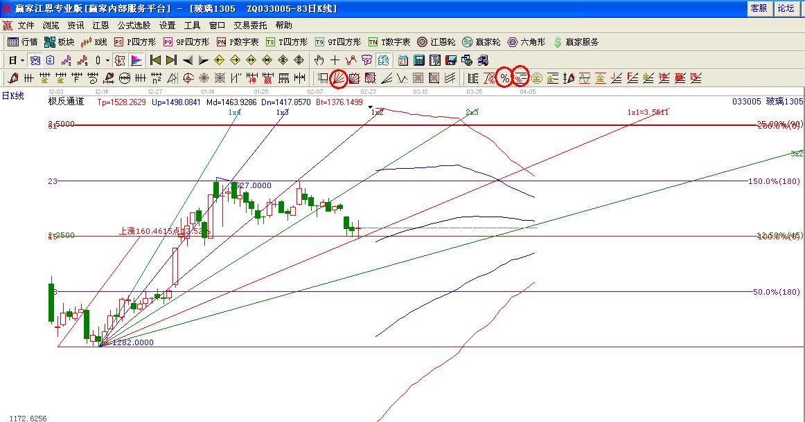 玻璃1282.00波動率為3.5611作圖角度線;1282低點(diǎn)作圖江恩價格百分比,然后在1282點(diǎn)的基礎(chǔ)45度位置做波段應(yīng)用波段百分比延伸線制圖: