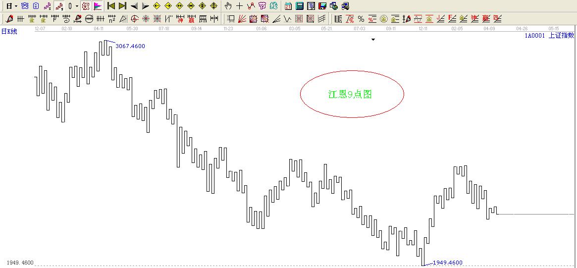 江恩9點圖的規(guī)則是: 若市場在下跌的市道中,市場反彈低于9點,表示反彈乏力。超過9點,則表示市場可能轉(zhuǎn)勢,在10點之上,則市勢可能反彈至20點,超過20點的反彈出現(xiàn),市場則可能進一步反彈至30至31點,市場很少反彈超過30點的。 對于上升的市道中,規(guī)則亦一樣。 在制作圖表時,若市況上升超過9點,圖表線可作上升,圖表線跟隨每日高點上移,直至市場出現(xiàn)9點的下跌,圖表線才跟隨下移至當日低點。這些讓我對其趨勢有了更深一層的了解。