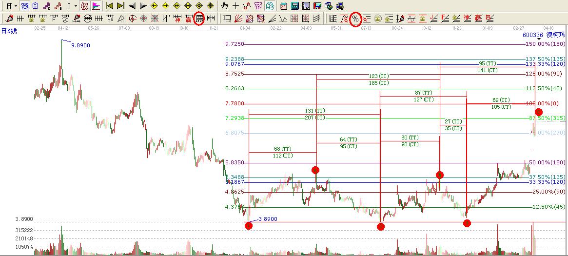 江恩理論之所以在金融界被稱作3大理論之一,是因為其很多東西久經(jīng)市場的考驗的,江恩是一套以時間為核心的理論, 對其金融市場進(jìn)行分析預(yù)測,其方法預(yù)測準(zhǔn)確性讓很多人癡迷,其實江恩的預(yù)測系統(tǒng)跟交易系統(tǒng)是完全獨(dú)立的2個系統(tǒng),在預(yù)測出現(xiàn)失誤的時候,會靠其嚴(yán)格的規(guī)則執(zhí)行紀(jì)律:例如規(guī)則2 在單底、雙底和三重底買入。今天我們就以600336 澳柯瑪對其解讀如圖所示:
