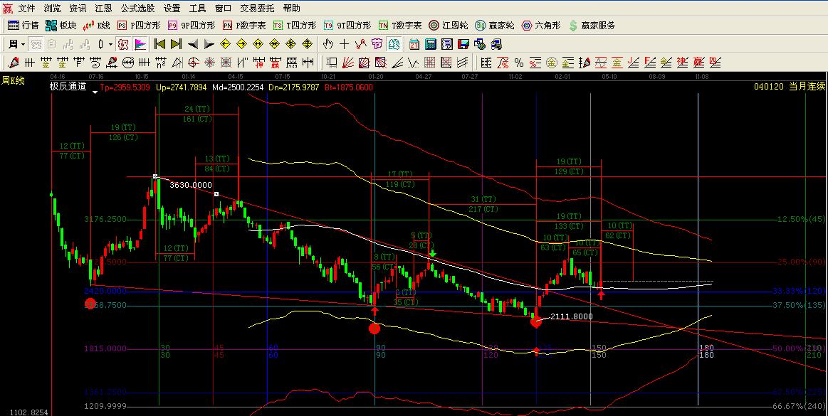 也可以從圖中看出股指期貨在其60周的時候出現(xiàn)為期5周的反彈,在其90周的時候出現(xiàn)了一波為期17周的反彈,始終被極反通道生命線死死的壓制一直陰雨連綿的下跌,在其重要的時間135度位置見底2111.80開始反攻,連續(xù)10周上揚10周剛好是其30周的3分之一而這波下跌也是剛好下跌了10周這波殺跌剛好到極反通道生命線的位置企穩(wěn)拉升,就是按照極反通道交易規(guī)則,極反通道生命線2460不破看高一線至藍色上軌的位置2952點。