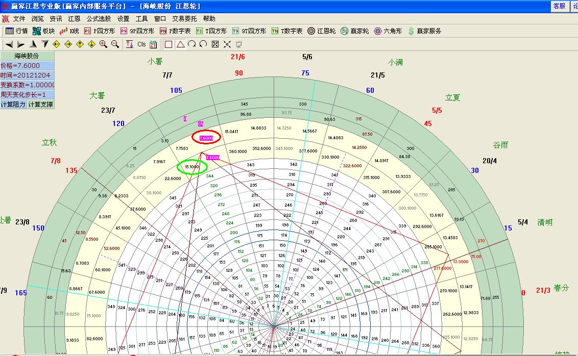 在看其江恩角度線最高點(diǎn)觸及了角度線2*3線位置, 次天再一次觸摸跌破也是最佳位置出局位置,這里也是其贏家江恩軟件工具極反通道紅色上軌強(qiáng)壓力位置的第2次觸摸,最為重要的是其江恩價(jià)格百分比0度位置是其15.20位置【次日盤中最高15.18】誤差了2分錢。種種提示都告訴你這里下跌不是偶然而是必然。