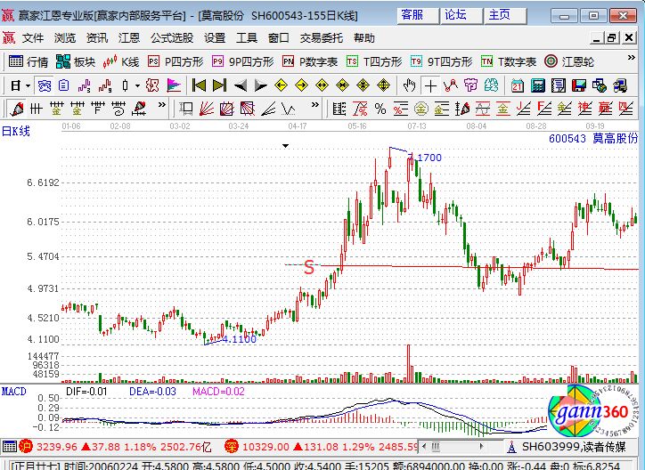 上圖是莫高股份的歷史走勢圖,該股從2006年3月10日一個階段性低點3.09元(圖中是現(xiàn)在除權之后的走勢數(shù)據(jù))邁步上漲,很快就漲到了同年7月11日的7.09元附近,累計近4元,如果是按照江恩50%回撤幅度計算,股價應該拉回到5.09元附近,我們就可以以此價格來畫出一條水平線S,透過水平線S來分析該股的價格波動發(fā)現(xiàn),在2006年8月4日首次觸及S,并受到下跌股價波動的慣性作用,股價一度擊穿了S線。