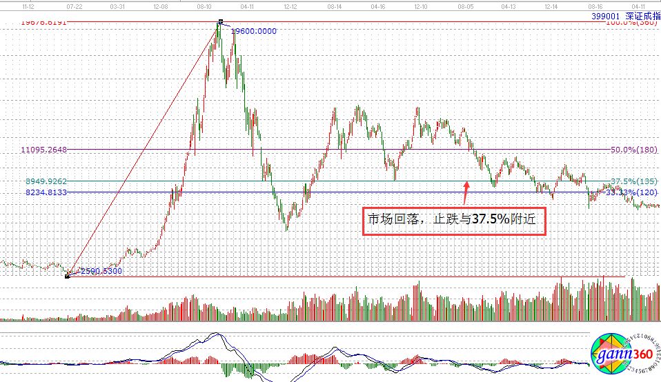 百分比回撤水平的探討主要是研究市場的價格,及阻力支撐的分析,因為一旦價格確定,其價格的波動區(qū)間也就確定了,所以,投資者重點關注市場的歷史走勢,以此為后市操作的重要依據(jù),例如市場每次回撤的位置都是在33.33%處,那么,你要參考的就不再是50%水平位,而是33.33%處,所以很多的時候在運用工具繼續(xù)分析的過程中我們要靈活運用。如下圖,市場回落,止跌與37.5%附近。