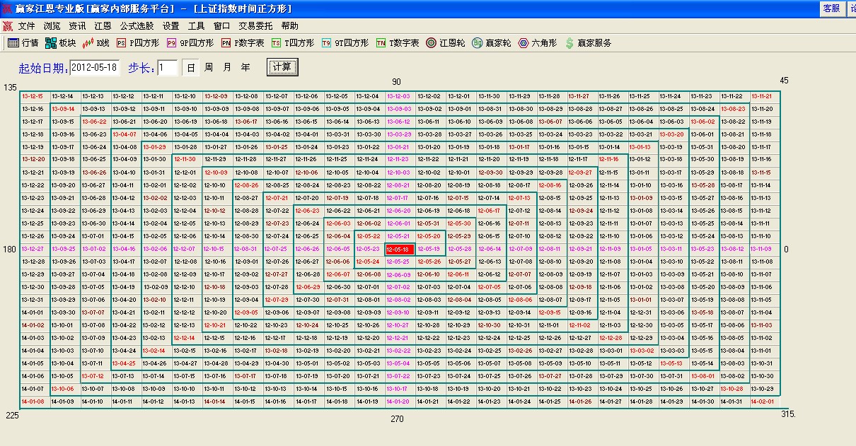 江恩四方形在贏家江恩軟件上使用方法已做過講解大家可百度查詢學(xué)習(xí),今天我們講下手動(dòng)做時(shí)間四方形,首先準(zhǔn)備一張白紙,用1*1的比例畫出四方格子,橫堅(jiān)為25格,圖形做好后中心格子為我們選擇的分析時(shí)間周期的起點(diǎn),然后計(jì)算好步長(波動(dòng)率),逐步逆時(shí)針展開可以繪圖了;