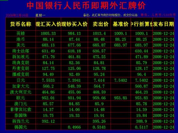 中國(guó)人民銀行根據(jù)前一日銀行間外匯交易市場(chǎng)形成的價(jià)格,每日公布人民幣對(duì)其他主要國(guó)家匯率的中間價(jià),習(xí)慣上,與匯率、匯價(jià)、外匯行市等同一個(gè)意義。在我國(guó)外匯牌價(jià)是以采取人民幣直接標(biāo)價(jià)方法,換句話所就是以一定數(shù)量的外幣折合多少人民幣掛牌公布。每一種外幣都公布三種牌價(jià)。即外匯買(mǎi)入價(jià)、外匯賣(mài)出價(jià)、現(xiàn)鈔買(mǎi)入價(jià)。現(xiàn)匯買(mǎi)入價(jià)是銀行買(mǎi)入現(xiàn)匯時(shí)的牌價(jià),而現(xiàn)鈔買(mǎi)入價(jià)則是銀行買(mǎi)入外幣現(xiàn)鈔時(shí)的牌價(jià)。