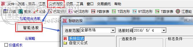 數(shù)據(jù)下載完成后,點(diǎn)擊軟件左上邊的【公式選股】——【智能選股】,進(jìn)入選股界面后,單擊左側(cè)的【智能選股】按鈕,彈出智能選股窗口。