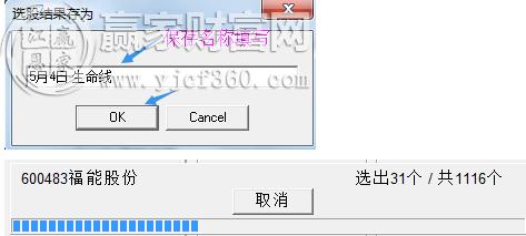 點(diǎn)擊【單條件選股】后,會(huì)彈出窗口【選股結(jié)果存為】窗口,填寫(xiě)輸入后,點(diǎn)擊OK按鈕,會(huì)出現(xiàn)滾動(dòng)條來(lái)執(zhí)行選股,結(jié)束后,點(diǎn)擊【關(guān)閉】按鈕即可完成。