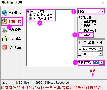 雙擊軟件右下角的燈塔圖標(biāo),打開(kāi)【行情連接與管理】,點(diǎn)擊左側(cè)的【數(shù)據(jù)下載】,在【上海證券】和【深證證券】前面的方框打鉤選中,右上角的下載內(nèi)容選擇【日線】,時(shí)間范圍選擇【全部】,下載速度選擇【普通】,然后點(diǎn)擊【開(kāi)始】,直至下載完畢。