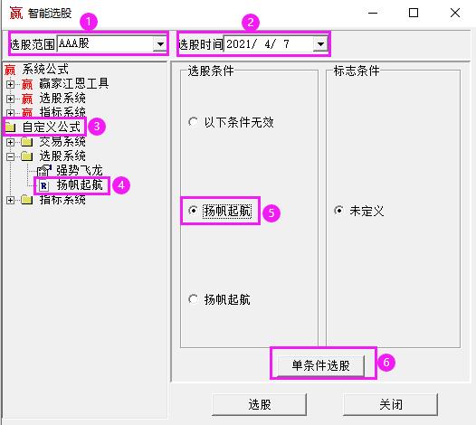 首先,選股范圍點(diǎn)擊旁邊的小三角,選擇AAA股,代表對(duì)滬市、深市、創(chuàng)業(yè)板所有上市公司進(jìn)行篩選。其次,選股時(shí)間默認(rèn)為當(dāng)日。接著,依次點(diǎn)擊【自定義公式】——【選股系統(tǒng)】——【楊帆起航】——【單條件選股】。