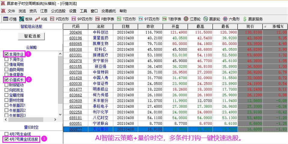 贏家江恩云策略智能選股功能,主要分為AI智能選股與技術(shù)選股兩大類(lèi)型,以日線數(shù)據(jù)為選股基礎(chǔ),多條件打鉤匹配,一鍵快速篩選優(yōu)質(zhì)個(gè)股。AI選股模型為贏家財(cái)富網(wǎng)數(shù)據(jù)倉(cāng)庫(kù)+時(shí)間周期密碼+數(shù)學(xué)量化模型+行業(yè)深度研究+資金動(dòng)向的智能選股平臺(tái),底層邏輯均是依托時(shí)間周期密碼運(yùn)行,目前贏家共推出十余種智能選股模型,詳見(jiàn)【贏家老子時(shí)間周期證券分析系統(tǒng)】介紹。技術(shù)選股主要將贏家多年實(shí)戰(zhàn)總結(jié)的選股模型編寫(xiě)成選股指標(biāo),幫助投資者來(lái)篩選出符合條件的個(gè)股。軟件主要精選了4個(gè)選股器,分別為揚(yáng)帆起航、強(qiáng)勢(shì)飛龍、股海擒龍和靈蛇之珠。先來(lái)了解下這4個(gè)選股器的設(shè)計(jì)原理及選出來(lái)的個(gè)股風(fēng)格,方便用戶(hù)根據(jù)自己的操作需求選擇相應(yīng)的選股器。
